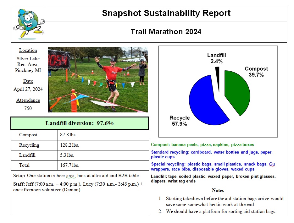 Main waste streams were pizza boxes for compost and beer cups and water bottles in recycling. They were low weight but high volume, filling two 96-gallon carts each. We also had a good amount of cardboard from water jugs, finisher medals, and T-shirts.