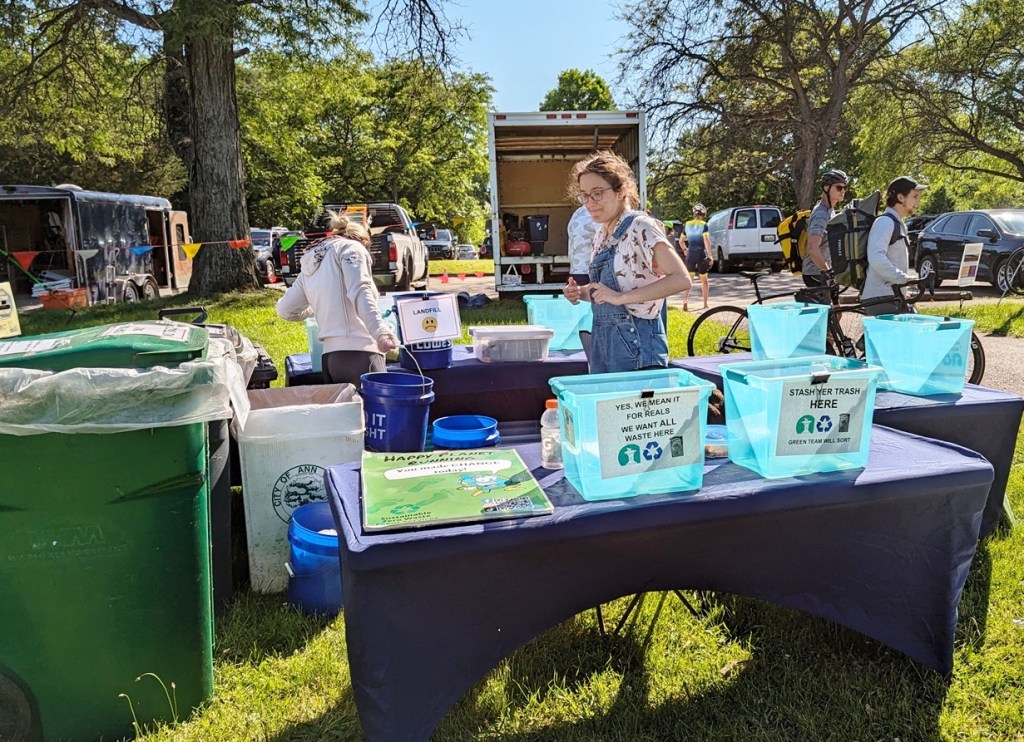 As usual, we set up the main Zero Waste station near the registration tent and a small satellite station in the finish line area. We also placed a large All Waste box at each transition entrance/exit. The new larger boxes were an improvement, reducing the frequency needed to swap them out. We also gave the evening off to four park trash cans in the race area, replacing them at takedown.