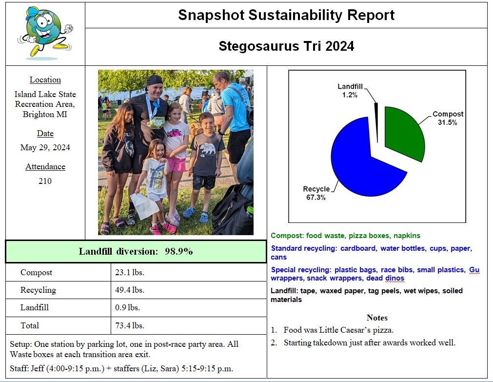 Overall waste was down roughly 15 percent from 2023, with recyclables cut by one-third while compost was up. Little Caesars pizza boxes were the main contributor to compost. Cardboard was cut nearly in half, perhaps due to fewer T-shirts and fewer boxes for finisher medals. Landfill was the same as 2023 at just under one pound.