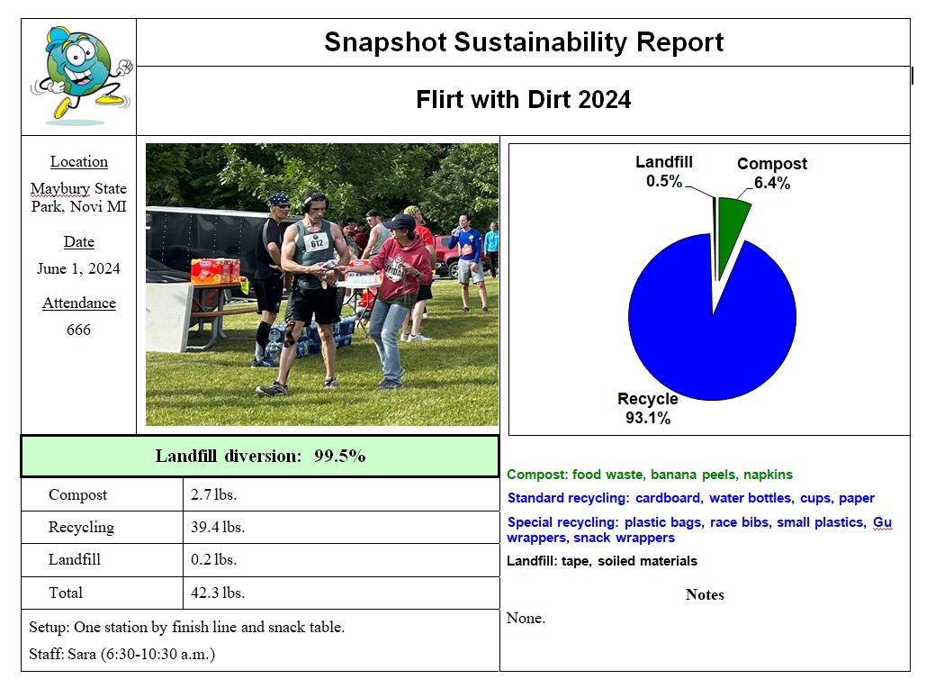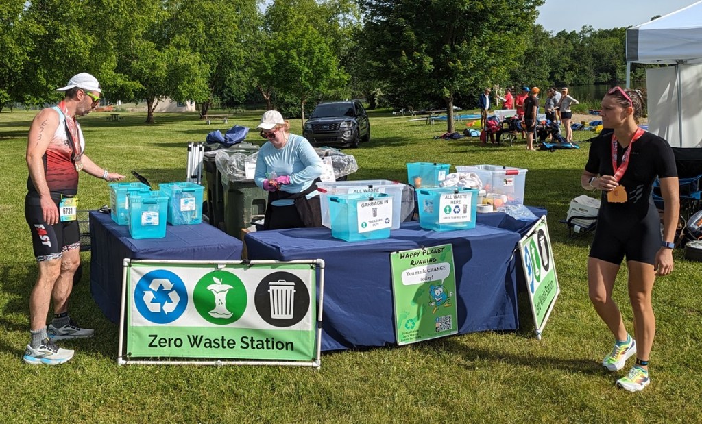For several years “running” now, Happy Planet Running has served two events on the same morning; Flirt with Dirt, put on by RF Events, and the Island Lake Triathlon put on by Epic Races. The following is a combined report of our efforts on June 1. Both went smoothly, with great landfill diversion percentage as usual for these events!