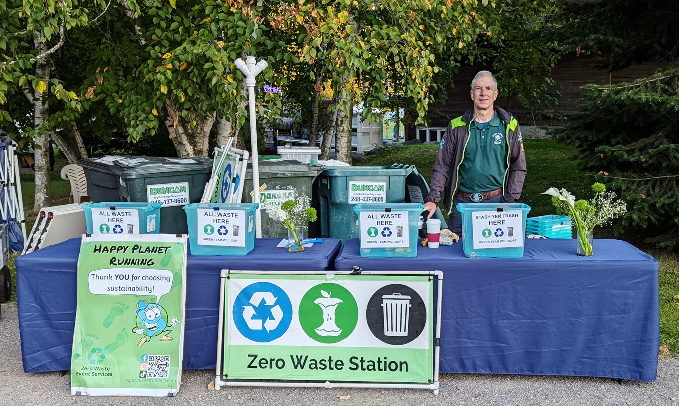 We set up our usual three stations in the party area, near registration, and by the porta-potties. An All Waste box was put in the transition area for those running the 5K and 5-miler consecutively. In the party area we put out two large All Waste boxes next to the busiest tables, and swapped them out when they got full.