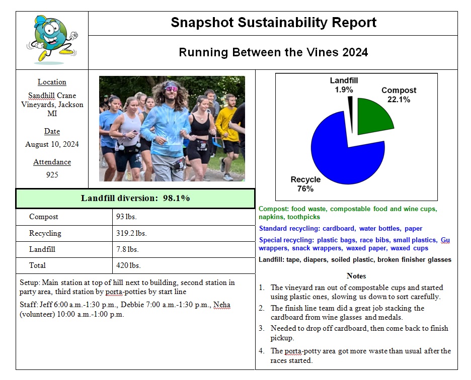 Running Between the Vines at Sandhill Crane Vineyards is always a long day for Team Zero Waste, but it has its compensations. The event features half marathon, 5K, and 5-mile distances, and a sophisticated afterparty with a live jazz band, Zingerman’s bread and olive oil, hummus, Mindo chocolate, and wine tastings served in a finisher’s glass.