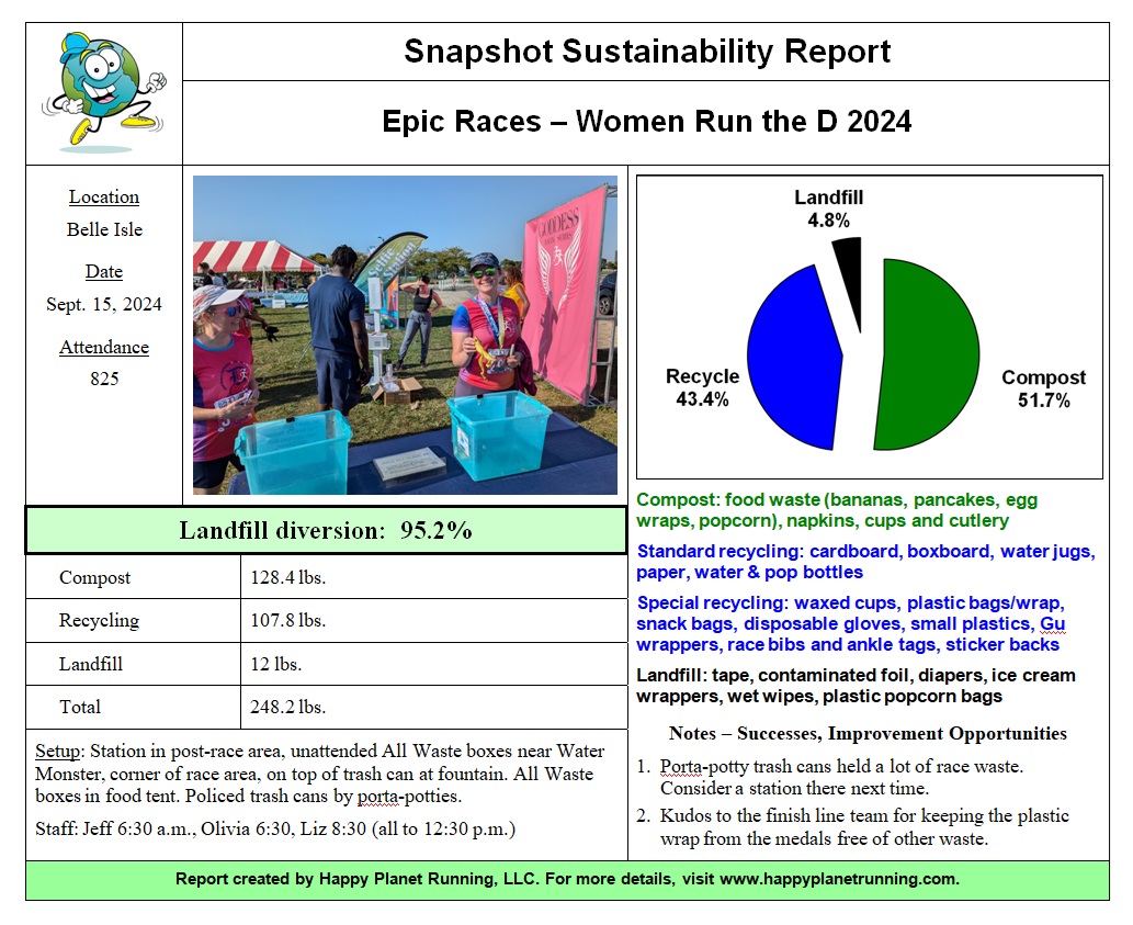 Total waste was up about 10 percent from last year, in line with increased attendance, so waste per 100 runners was about the same – 30.1 lbs. vs. 29.5 lbs. Compost made up about half the waste, with cardboard the next highest contributor. Landfill consisted of the usual suspects – tape, contaminated foil, diapers, ice cream wrappers, wet wipes, and greasy plastic popcorn bags.