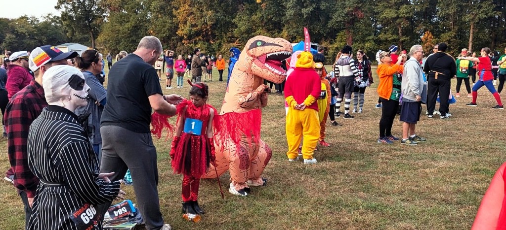 It was full-on early Halloween at Run Scream Run at Wiard’s Orchards. Over 700 superheroes (and villains), scary creatures, and even hobbits showed up to run the 5K, 10K, or one-miler through the orchard, nearby trails, and the Haunted Village at the end. The hobbits were happy to see the Green Team. “We definitely recycle in the Shire,” they told us.