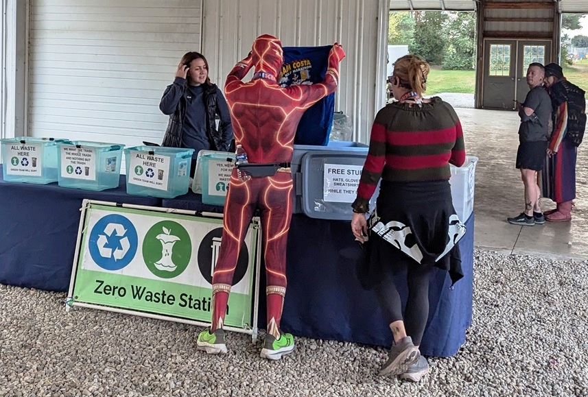 It was full-on early Halloween at Run Scream Run at Wiard’s Orchards. Over 700 superheroes (and villains), scary creatures, and even hobbits showed up to run the 5K, 10K, or one-miler through the orchard, nearby trails, and the Haunted Village at the end. The hobbits were happy to see the Green Team. “We definitely recycle in the Shire,” they told us.
