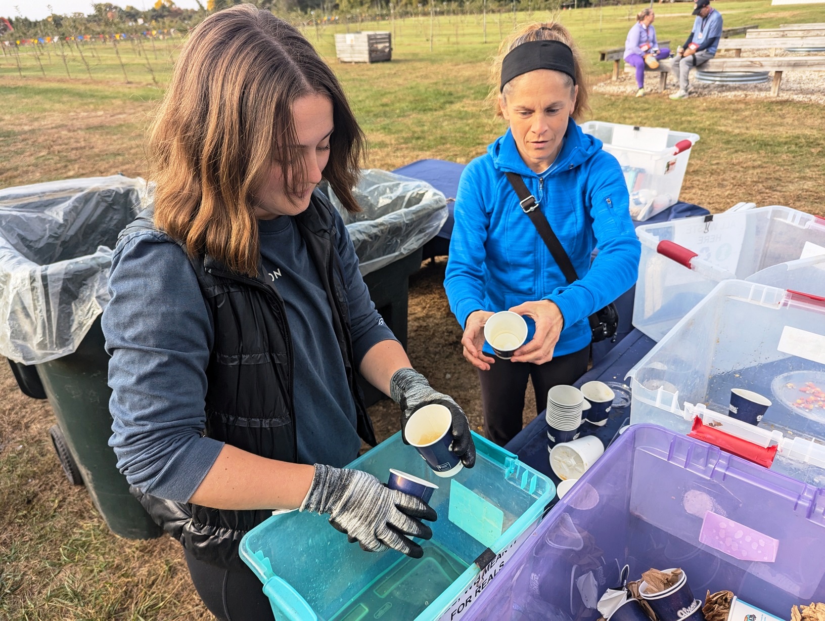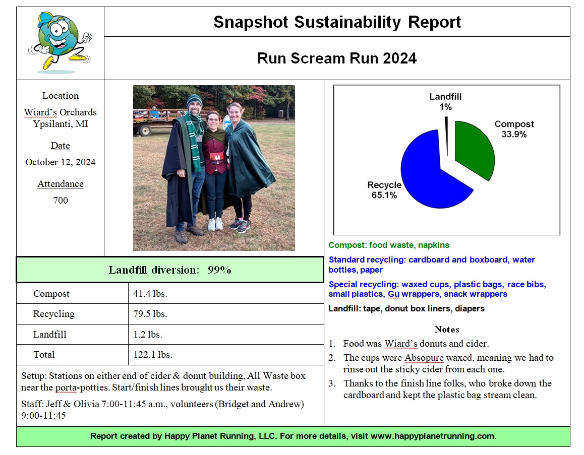 As usual, we set up Zero Waste stations on either end of the building where cider and donuts are served. We added an All Waste box near the porta-potties. The finish line crew brought us cardboard, collected wrap from awards and other miscellaneous items.
