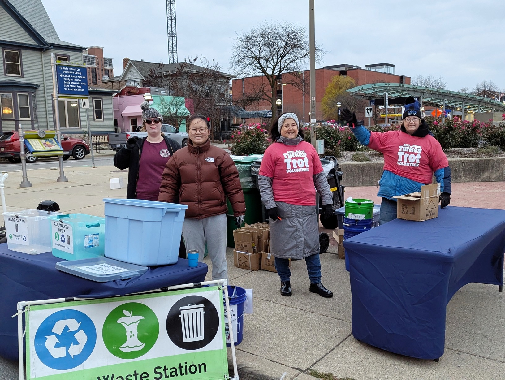 We set up the main Zero Waste station at the corner of Liberty St. and Fifth Ave., and another directly across the street, near the Bearclaw Coffee trucks Based on a lesson learned from last year (overstuffed trash can) we put another station just past the trucks. And seeing litter on Liberty at Santa’s Village near Division, we added a large All Waste box there. We also put All Waste boxes at the corner of Liberty and Fourth, covering the trash cans there.