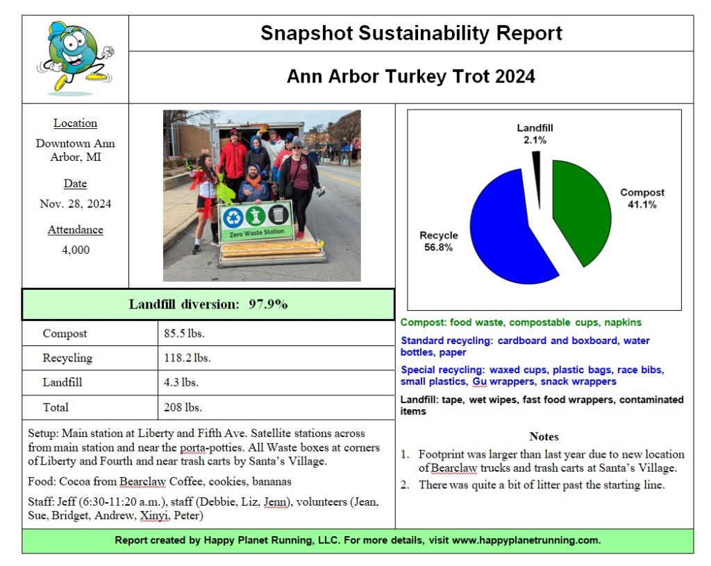Total waste was nearly even with last year, with compostables slightly up and recycling slightly down. Landfill was just over four pounds, an increase from last year. We collected a lot of tape, fast food wrappers, and other miscellaneous stuff picked up off the street in the race area.