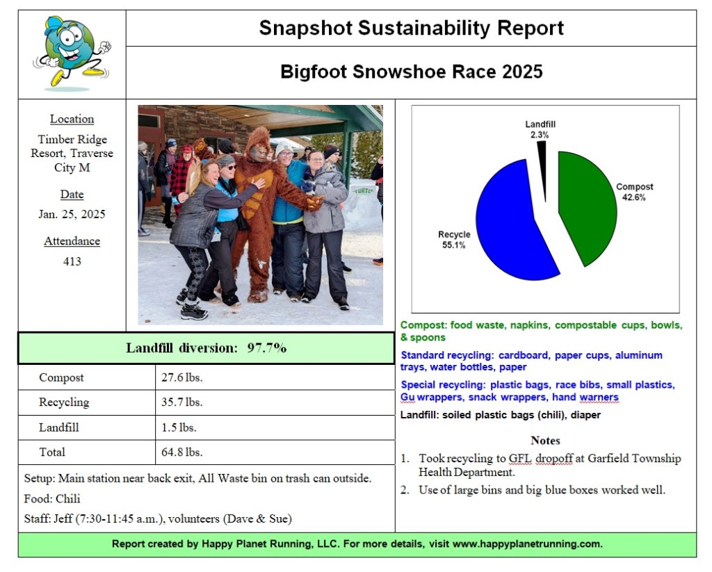 Conditions were perfect for the annual Bigfoot Snowshoe Race at Timber Ridge Resort in Traverse City. Temps in the 20s and plenty of snow for the over 400 shoers doing the 5K, 10K, or one-mile through the woods and ski trails. For yours truly (Jeff) it was the 12th straight year of lung-busting in the 5K.