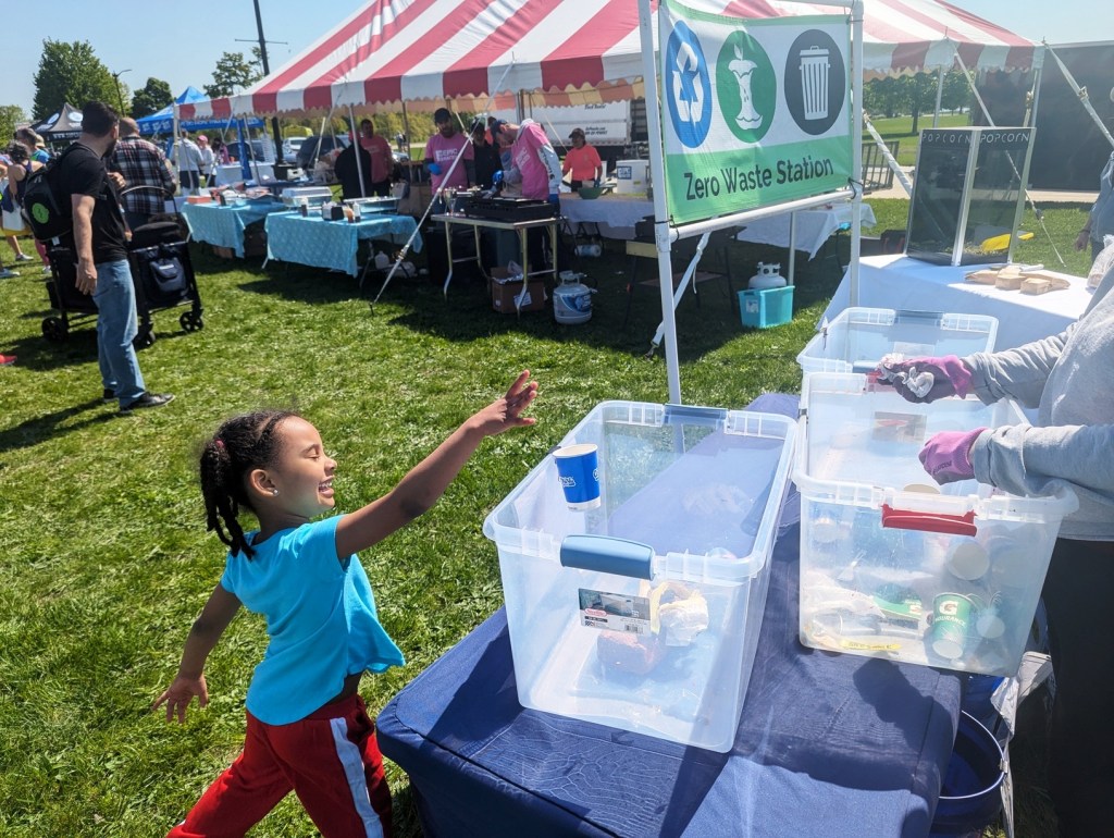 We set up two staffed Zero Waste Stations, one next to the food tables, and one at the entrance/exit to the adult beverages area. We also put an All Waste box next to the Water Monster in the finish area to collect cups. At the finish line we collected the plastic wrap from the medals and left a box for used cable ties. We also gave the kitchen staff a box for used disposable gloves and a couple for miscellaneous waste.