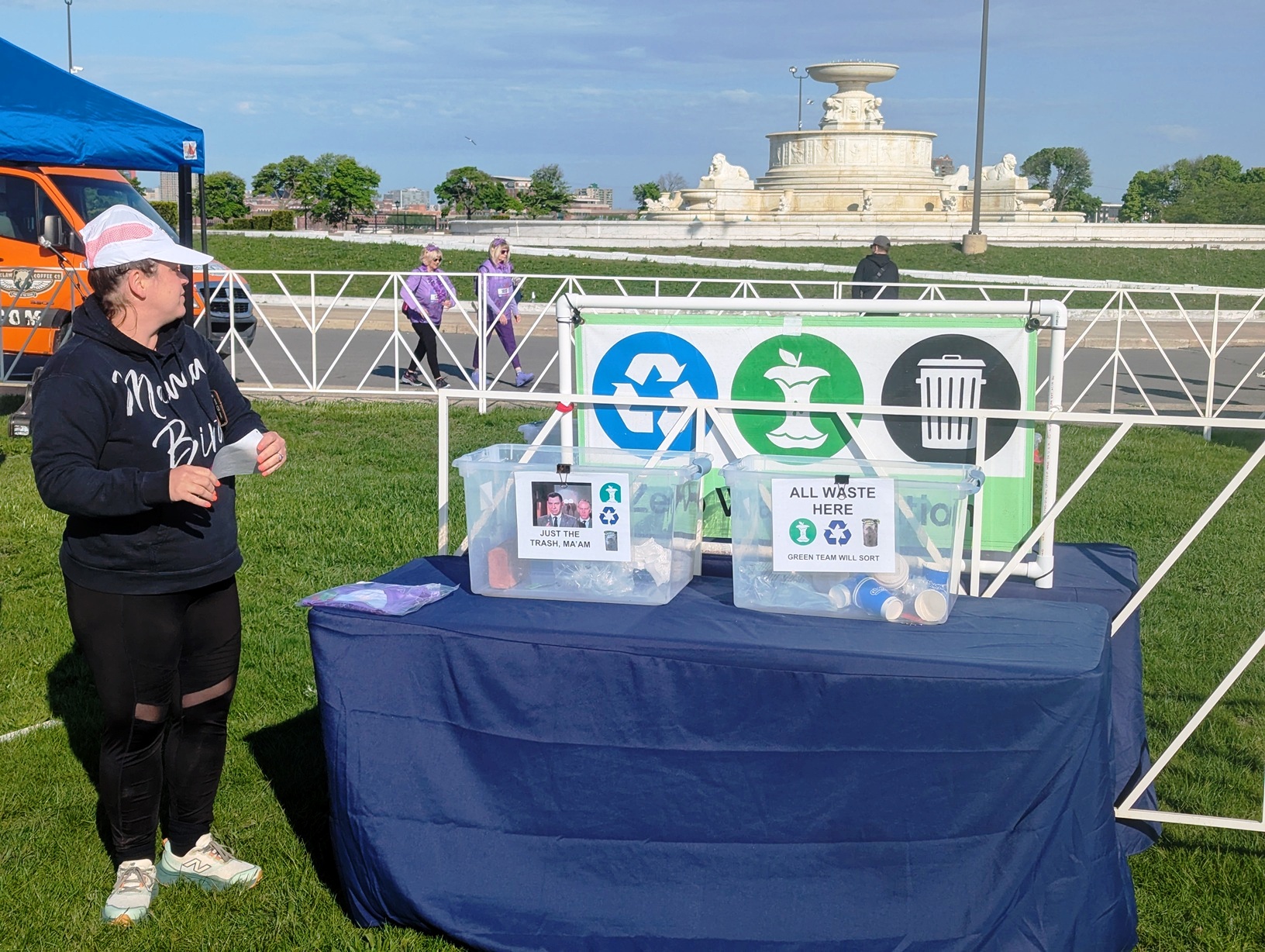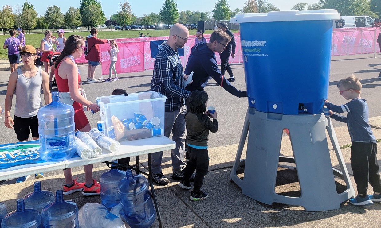 One small issue was the mixing of traditional waxed paper cups with the plain paper ones, which we had to sort out separately. The waxed ones are a sponsor requirement. (Now if we can only convince them to provide compostable branded cups.) But either way, the cups are a huge improvement over disposable plastic water bottles, in volume in ease of handling, and overall sustainability. Love the Water Monster!