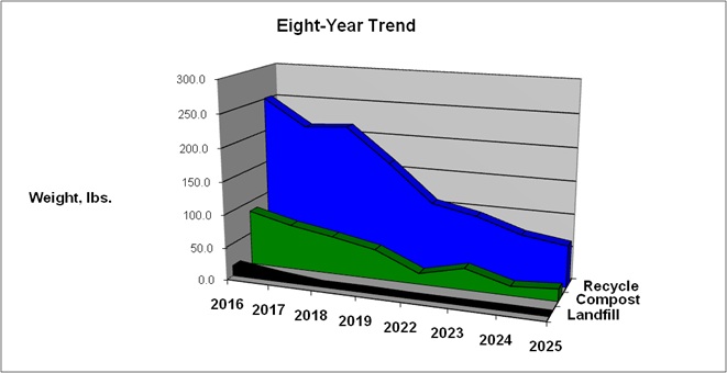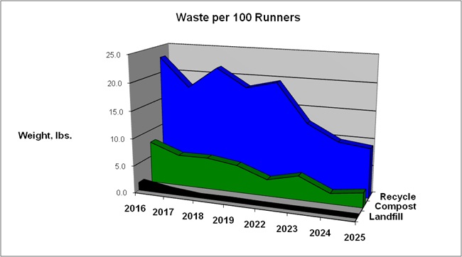 The largest percentage of the waste was cardboard (half the recycling total of about 76 percent), while landfill made up the smallest percentage at 0.6%, with just a half pound by weight. The total amount of waste produced at this event continues to drop, a great trend. Below is the chart, with another for waste per 100 runners, which overall follows the same trend.