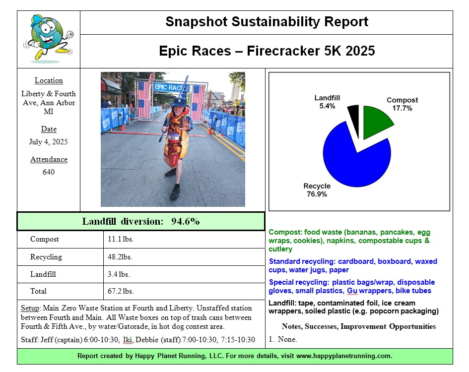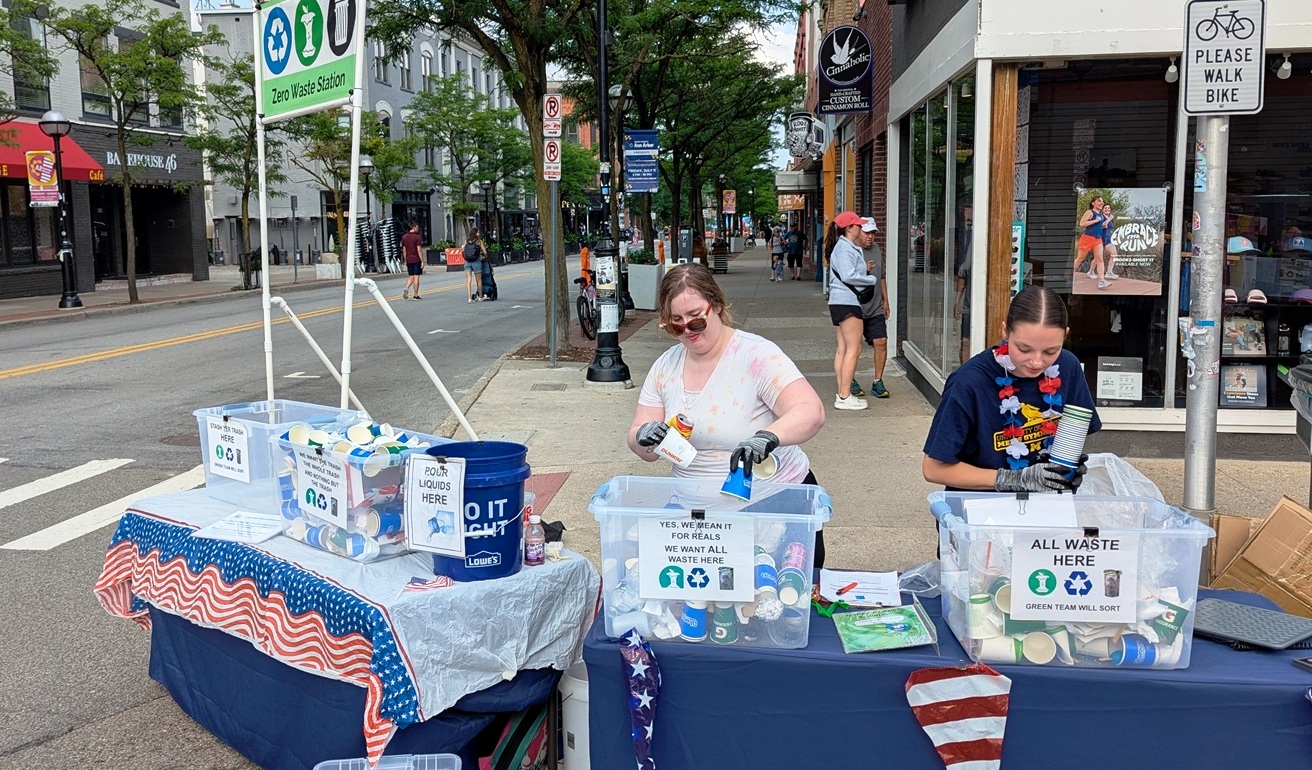 Our main station was at Liberty and Fourth near the Fleet Feet store, near the water and bomb pops at the finish. A small unstaffed station was set up farther down Liberty toward Main St., after the runners had all started. We covered City trash and recycling cans on Liberty between Fourth and Fifth and put All Waste boxes on top. All Waste boxes were also provided to the hot dog eating area and next to the water table at the finish line.