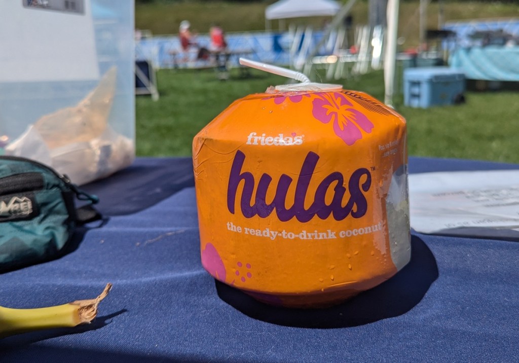 The biggest volume of waste came from the nine water stops, the bags arriving throughout the event as they closed. But thanks to my sister Jen and intern Cole, we got through them, with just a couple last-minute bags I sorted the next day. But one item in particular that showed up at our station (NOT from Epic Races) gets my nomination for Most Wasteful Packaging Ever. Check this out – a coconut wrapped in plastic.