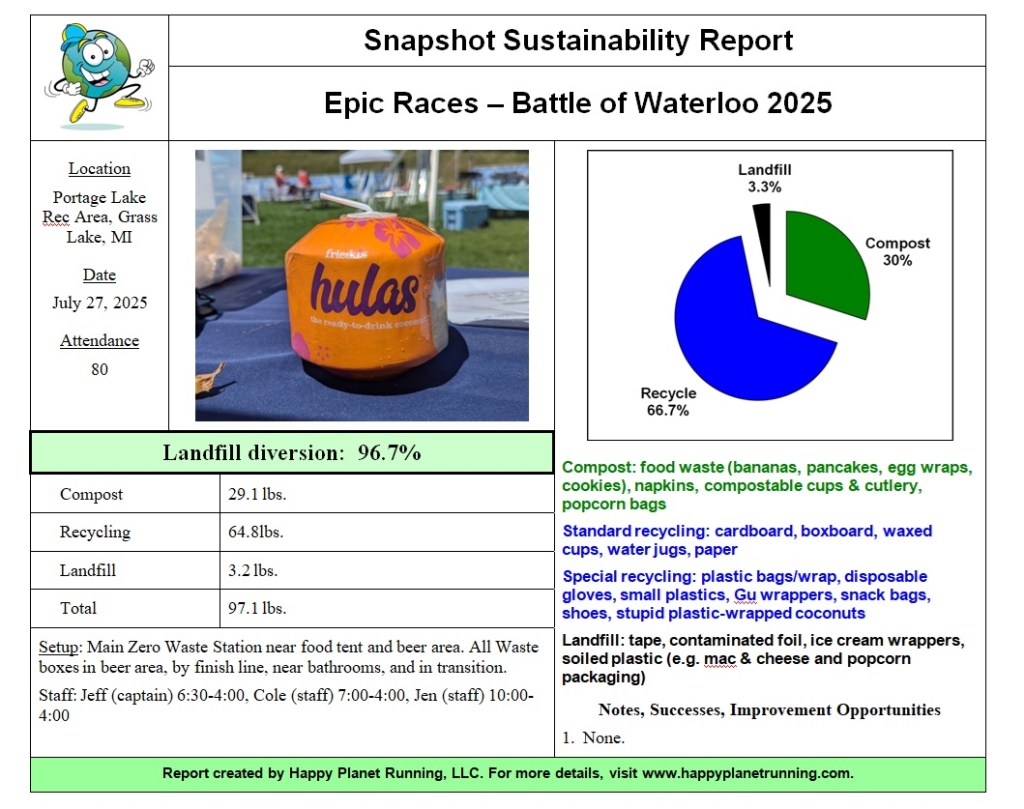 The Epic Races Battle of Waterloo is a combo of swims, bikes, and runs, through the Waterloo Recreation Area. It’s the only event of this kind I’m aware of, and it’s only held every two years. Athletes can choose the “full battle” of ten stages over 42 miles, or “half the battle” of six. Either way there’s a lot of food options awaiting the finishers, so Happy Planet Running was there to keep the event environmentally friendly, as befits this beautiful nature area.