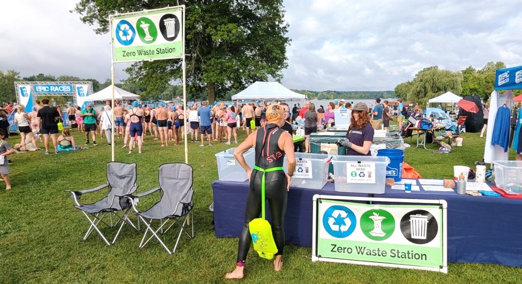 We set up our staffed station across from the food area and next to the Epic Races merchandise tent. All Waste boxes were set up near the Bearclaw coffee truck, in the kitchen area (along with a box for disposable gloves), at the finish line water station, and on top of park trash cans near the parking lot and the race area porta-potty. These all worked well, and we had only one “rogue trash can” – a cardboard box in the kitchen that I caught before it got out of hand.