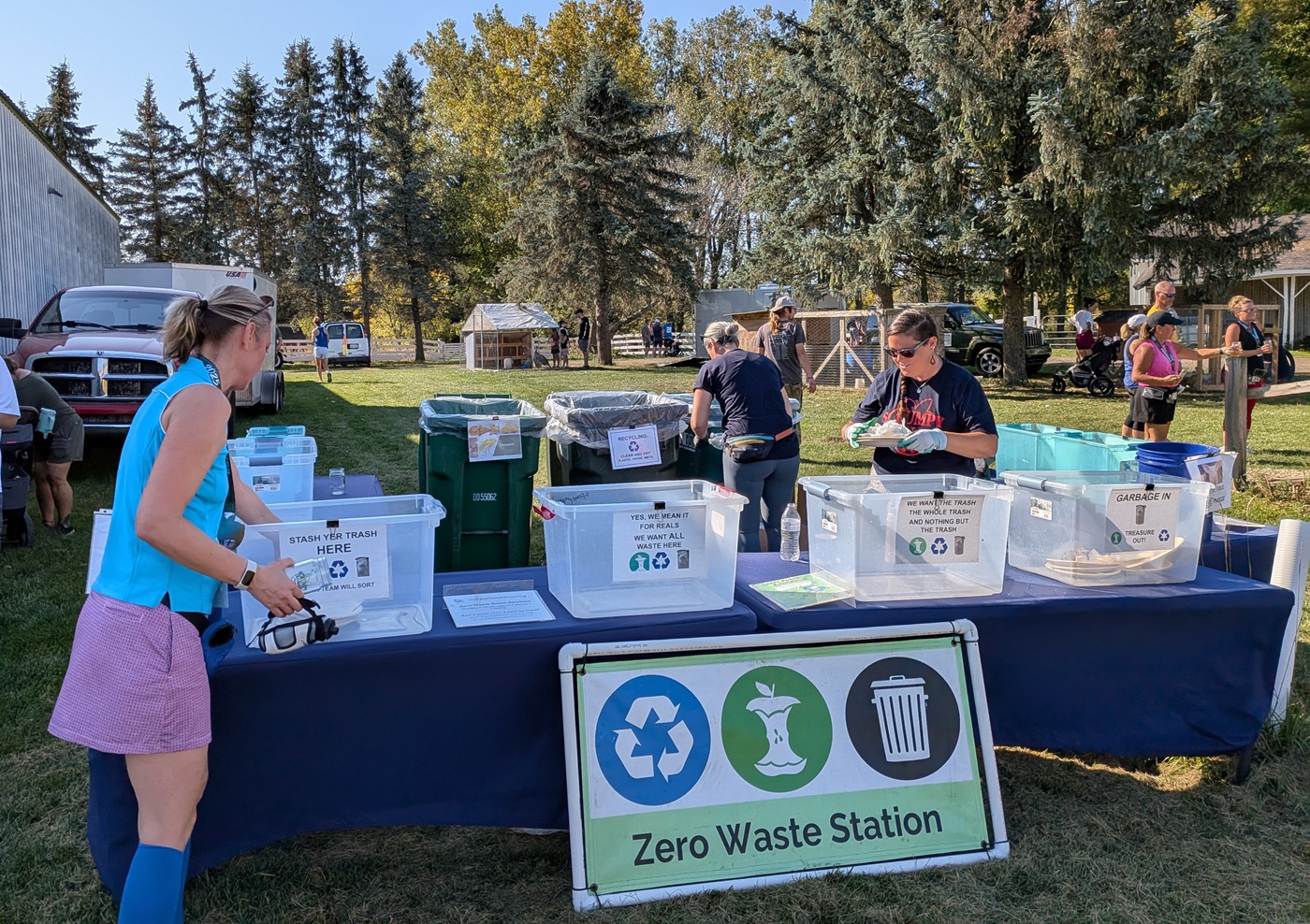 I placed the main Zero Waste Station at the exit of the post-race area, although I moved it to the center instead of to the side, to allow for better access and visibility. A Zero Waste box was placed at the entrance to the building serving cider, as usual, and added an unstaffed station a little past the finish line. With regular policing and swapping out, this kept a lot of water bottles out of the orchard’s trash cans. I also put two All Waste boxes at the starting line and retrieved them after the final race started.