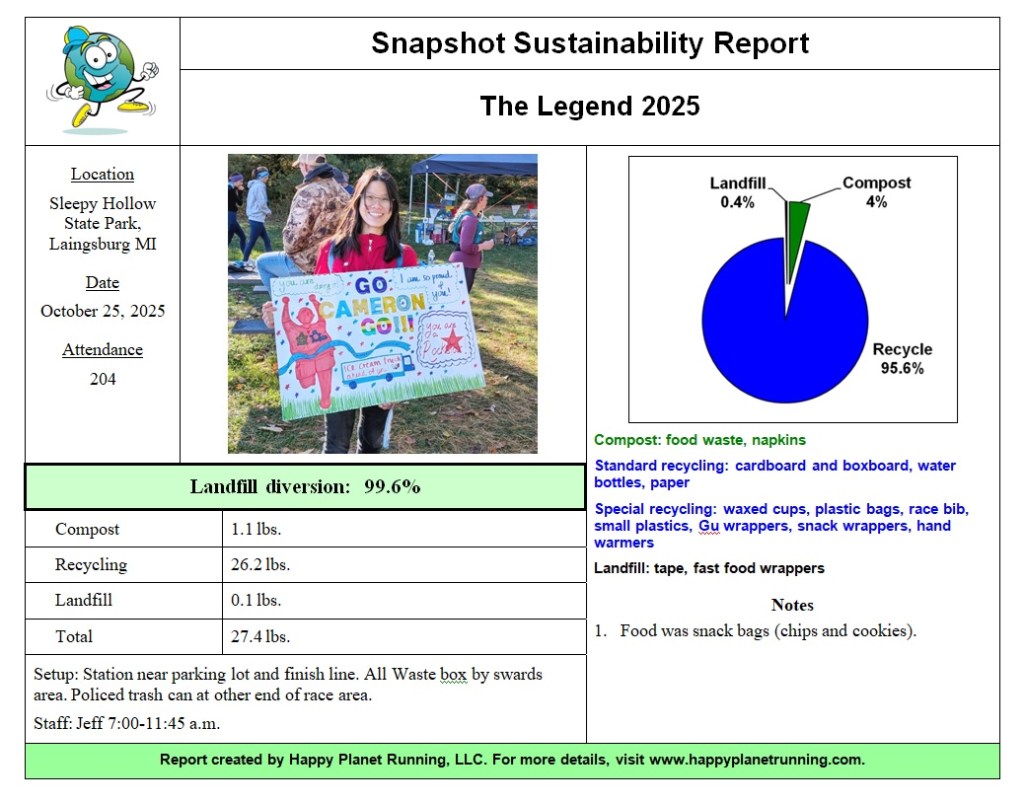 Total waste was the lowest ever for this event at just over 27 lbs. and the smallest amount of landfill with just a few pieces of tape and some fast food wrappers. Going out with a minimal footprint seems like a suitable farewell to a trail run!