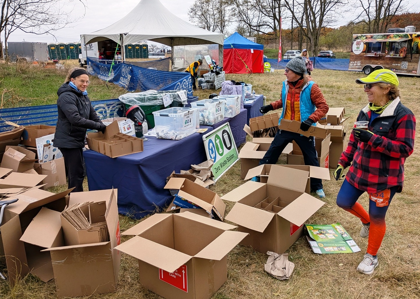 Our Zero Waste station was in the party area across from the beer tent. We put All Waste boxes at the entrance, near the games area, and at the beer tent. We put out “Free Stuff” boxes of warm clothes and items like water bottles and space blankets. Not a lot taken this year. Not sure why, but demand is different every time.