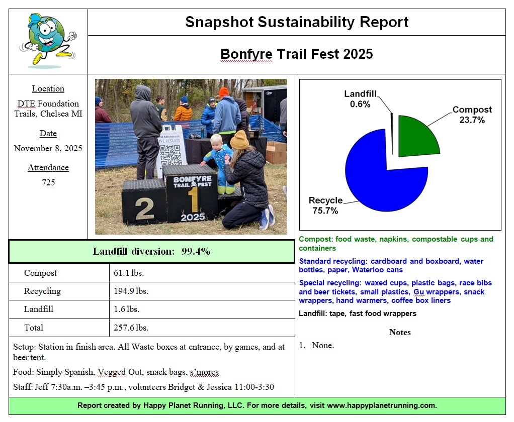 One opportunity for improvement: find a way to not tear off beer tickets from race bibs. They are only recyclable through TerraCycle and can blow around everywhere. A mark with a Sharpie would accomplish the same goal. Not really complaining, though, with less than two pounds of landfill!