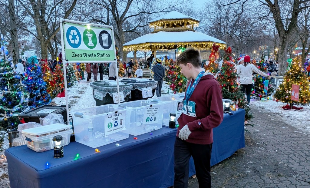 We wrapped up just before 3:00. I unloaded the full carts at home, loaded fresh carts for the afternoon, and was at Monument Park at 3:30 to set up for the 5K. A Christmas tree display occupied much of the park, so there weren’t many places to set up visible Zero Waste stations. We set up one between the tall monument and the bandstand (where Santa was) and put All Waste boxes on the nearby trash cans. I checked a couple other cans farther away and retrieved the race waste from them, as well as some compostable cups from an earlier event that day. (A compostable cup going to landfill has no advantage over any other cup.)