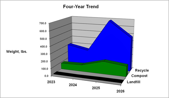 Plastic bags and wrap continue to be a large contributor to waste volume, if not weight. We had enough to fill two 96-gallon carts. Everything seemed to come wrapped in plastic, even the 4-pack safety pins used to secure race bibs to clothes. There is a big opportunity here to reduce overall plastic use.