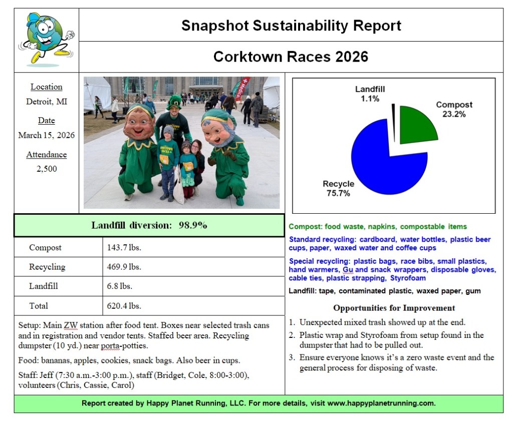 Another March means another St. Patrick’s Day, and that means another Corktown Races at Roosevelt Park in Detroit. Over 2,500 people showed up to drink beer and do a little running on the side, and once again, Happy Planet Running was there to make sure it was all sustainably enjoyed.