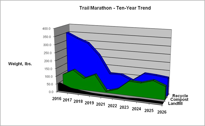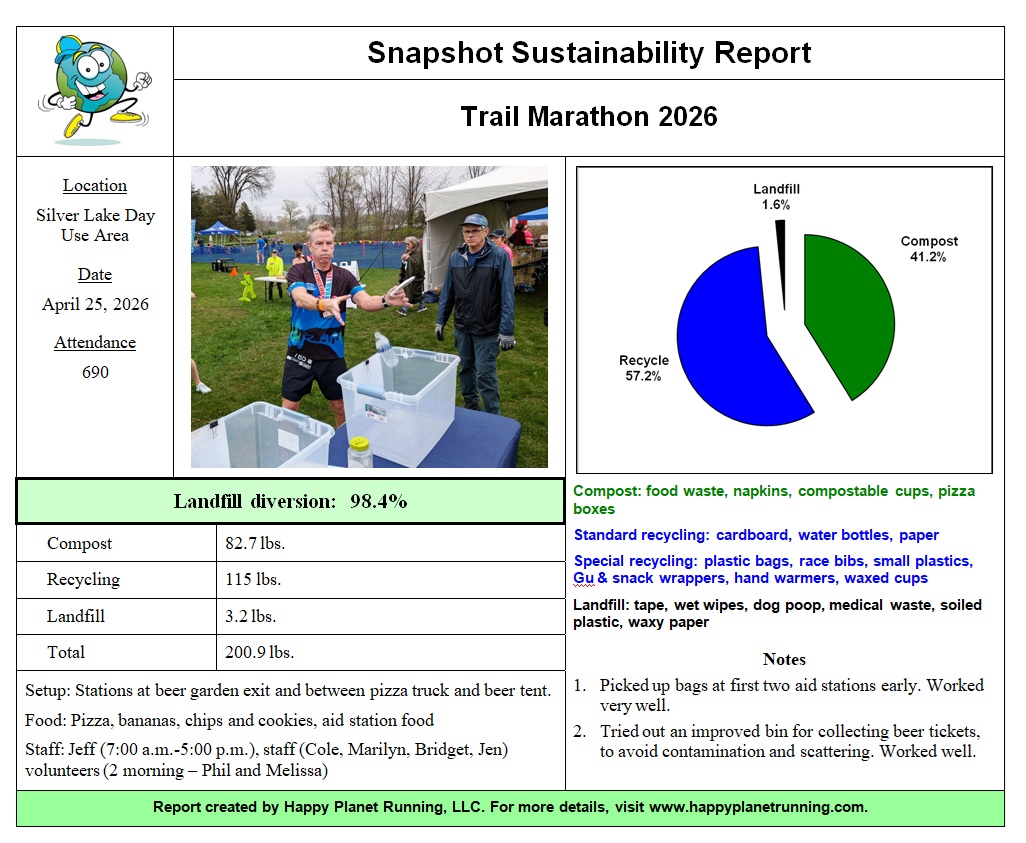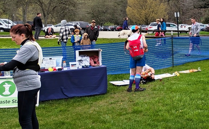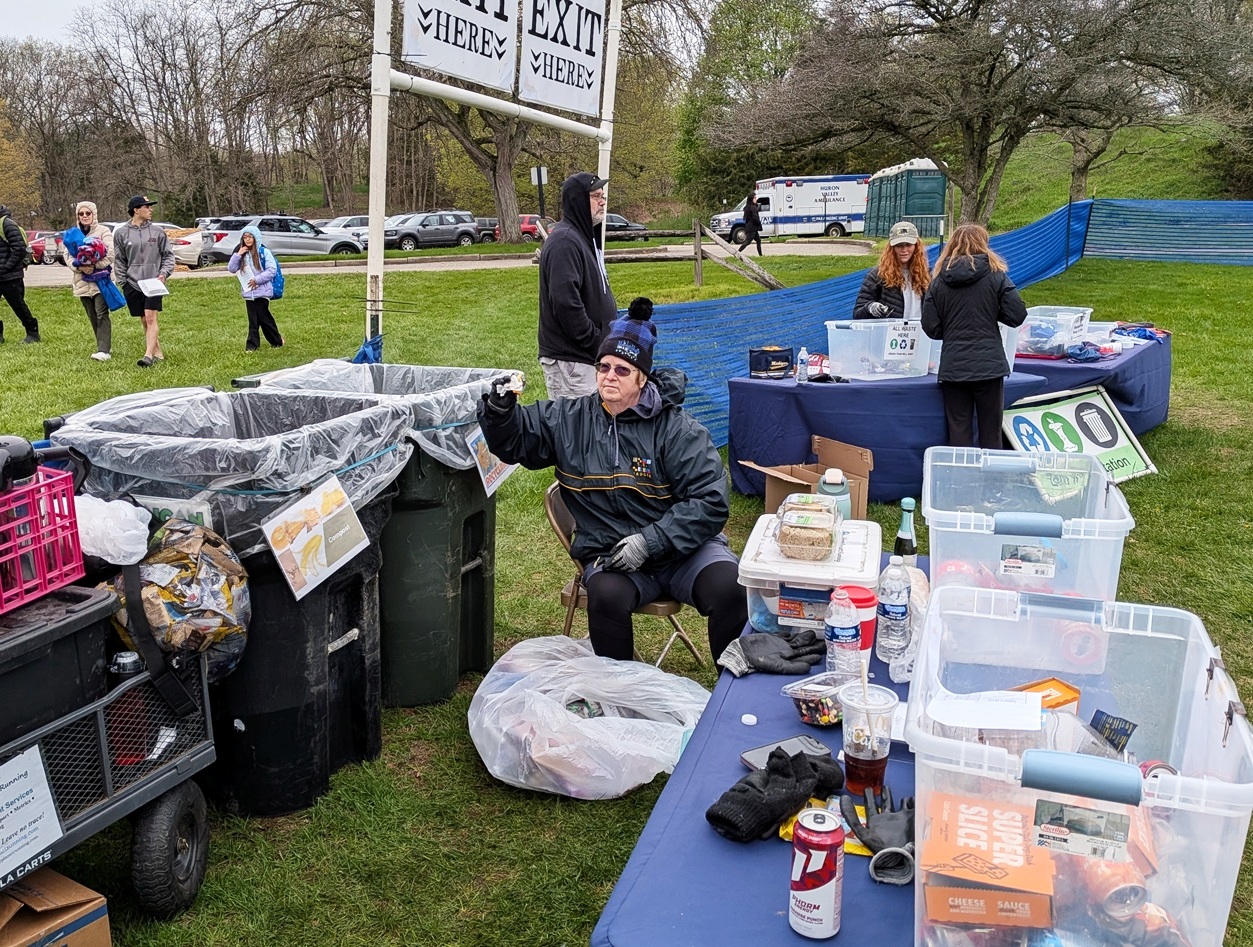 Many thanks to the morning team of Marilyn, Cole, Phil, and Melissa, and the afternoon team of Marilyn, Bridget, Sue, and Jen. They kept up with the onsite runner waste and dove right into the messy aid station bags. Great job!